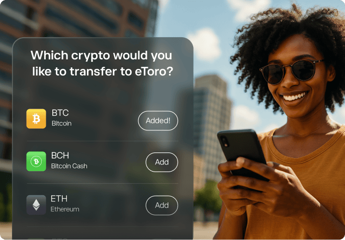 Transfer crypto via your eToro wallet to open an investment position of the same value instantly. Your assets become part of your active portfolio, ready for trading, withdrawal, or earning staking rewards.
