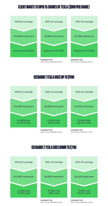 It is important to note that any profits and losses will be calculated according to the total size of your position, not the capital invested. In other words, if you invest $100 in a position and apply 5X leverage, the total size of your position is $500 and, as such, profit or loss will be calculated according to the latter sum.